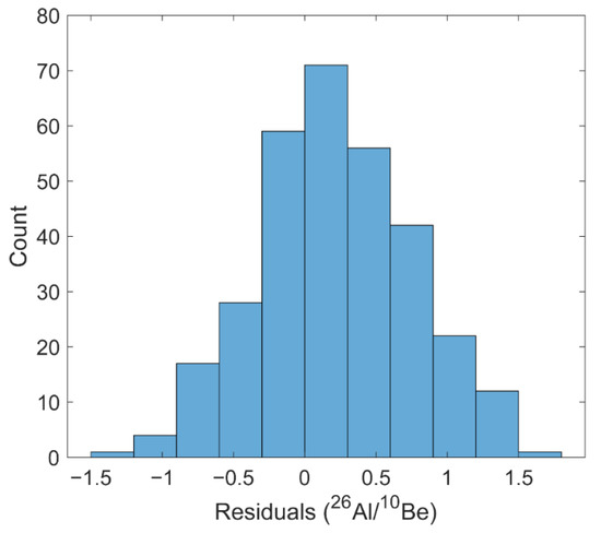 Residuals histogram showing differences between production ratios predicted by the LSDn scaling scheme for samples in the ICE:D compilation and measured 26Al/10Be concentration ratios. The similarity in residuals distribution seen here compared to Figure 2B, the residuals from our bi-variate model based solely on measured ratios, demonstrates the good fit of LSDn scaling to empirical data.