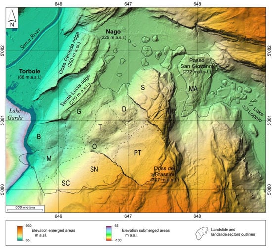 The prominent release areas in the surrounding bedrock slopes, for example, at Paternoster, and the blocky deposits in the Nago-Torbole region have been recognized and mapped for more than a century. In his Rovereto-Riva map (scale 1:75,000), Vacek [43] did not represent any landslide in the area. On the contrary, in his map, Habbe [44] drew three landslide deposits coming from Doss dei Frassini, by adding the deposit named here as Marocche located to the south of the Gorte deposits. In the Nago-Torbole area, Perna [28] mapped eight different landslide deposits, five of which correspond to the Daine, Tiro a Volo, Gorte, Busatte and Marocche deposits as shown in Figure 4. Note that we use the term “Gorte” to refer to the whole of these deposits, excluding Marocche to the south.