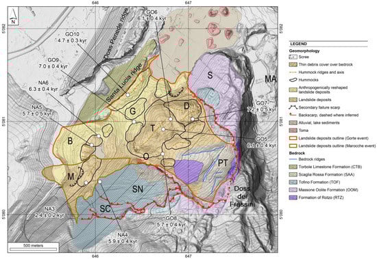 Sixteen samples were taken for 36Cl dating from sites all across the Gorte and Spiaz de Navesele landslide deposits. Ten boulders and six bedrock detachment surfaces were sampled with a battery-operated saw and hammer and chisel (locations shown in Figure 5). Boulders were sampled following the guidelines described in [49]: selected boulders were large in size (>2 m in height) to avoid displacement after the landslide, as massive as possible, and sampled from a surface not parallel to the bedding, in order to avoid pre-exposure (cf. [30]). The lithologies of all the samples are shown in Figure S1 of the Supplementary Material. Samples GO5-GO8 and GO10 were composed of OOM, while the GO9 and NA3-NA6 samples were composed of TOF.