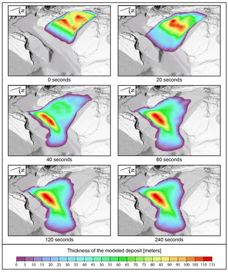 Following the reconstruction of the pre-failure topography, we performed numerical runout modeling based on the methodology described in Section 3.4. The initial calibration step resulted in a best-fit bulk friction angle of 14° and a flexible block time of 10 s. As described above, the reconstructed rupture surface is compound, and thus movement over this surface requires internal deformation of the failed mass. We expect that fluidization of the initial failure occurred when the center of mass moved from the upper part, where the sliding plane is steeper, to the lower part with the less steep plane. A friction coefficient of 0.38 and turbulence coefficient of 700 m/s2 were found to provide the best-fit Voellmy parameters between the simulated and observed runout. Interestingly, these values are comparable to back-analyses of case histories that overran the bedrock [7,24,69,70].