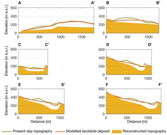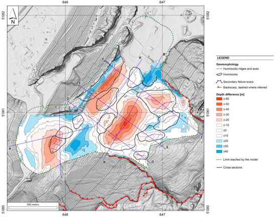 Figure 10 shows the elevation differences between the modeled landslide topography and the actual topography, and Figure 11 compares various cross-sections of the measured and estimated deposit depths. In Figure 10, the white colors show the area where the elevations of the modeled and actual landslide deposits are similar. In contrast, the red areas indicate where the modeled deposit is thinner than the actual one, while the blue areas indicate where it is thicker. Extreme values shown at the cliffs, particularly at the northern flank and in the southernmost corner of the Santa Lucia ridge, are not to be considered real differences but artifacts due to the presence of steep cliffs in these areas. The deposit below the lake sediments of the Nago plain has been removed, as, there, it is not possible to precisely define the real thickness of the lacustrine sediments. Overall, Figure 10 and Figure 11 show that there is good agreement between the actual and modeled deposit thicknesses, which only differ where the large hummocks are present, especially in the Daine, Tiro a Volo and Gorte sectors. A similar observation has been noted in runout modeling results for the nearby Molveno rock avalanche [12].