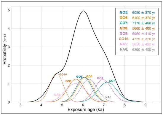 Camel plot for the eight 36Cl exposure ages for boulders from the Gorte rock avalanche deposits. Colored lines show individual exposure ages and the Gaussian distribution of the uncertainties. The black line indicates the summed probability distribution for the dataset. The mean of the ages is 6.1 ± 0.8 ka.