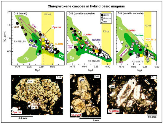 Plots of TiO2 (wt%) versus Mg# for the clinopyroxene cargoes in the D16 basalt, and D11 and D19 basaltic andesites. These are hybrid basic lavas erupted at the MV south-eastern flank (Figure 1a). Note that these cargoes display a similar chemical variability, irrespective of the chemistry of the carrier lava, that covers most of the D5 and D2 fields. The crystals are tagged as in Figure 2; further photomicrographs are reported in Supporting Materials (Figures S3 and S4). Only in these lavas, partially resorbed clinopyroxene crystals (Cpx res) and gabbroic clots with open, sub-circular texture (Enclave) were found. Analytical error, yellow box and vertical band are displayed as in Figure 2. Light and dark green fields represent D2 and D5 clinopyroxenes, respectively, recording Stage A and Stage B crystallization in the deep MV mush.