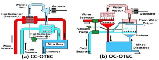 OTEC systems: closed cycle (a); and open cycle (b) [6] (Reprinted with permission from National Energy Laboratory of Hawaii Authority).
