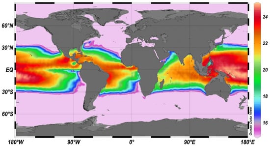 Distribution of annual average temperature difference between 1000 m deep water and surface water (Reprinted with permission from ref. [10]. Copyright Gerard Nihous, University of Hawaiʻi at Mānoa).