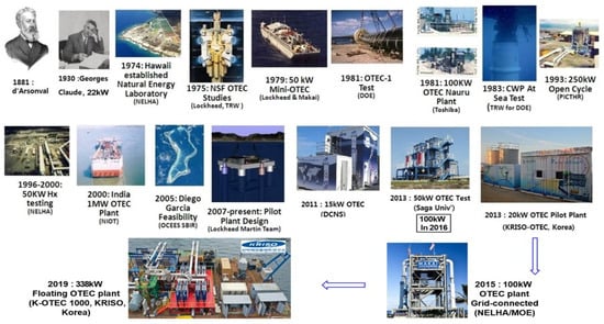 OTEC is one of the marine energy technologies that has not been commercialized in spite of the fact that it has had a long history (Figure 3). Jules Verne’s marine science novel ‘20,000 Leagues Under the Sea’ published in 1870, brought the existence of ocean thermal gradients to the world. In 1881, the theoretical basis for OTEC was developed by D’Arsonval, with the first electricity generated through OTEC technologies, in 1930, by George Claude. Hydrocarbons, particularly cheap and abundant oil supplies, inhibited further development of OTEC until the global petroleum oil crisis of 1973, which encouraged further research and development in the United States and Japan. In 1978, the U.S. succeeded in the operational realisation of OTEC through its ‘Mini-OTEC’ project (Figure 4a): a 50 kW offshore closed-cycle OTEC power plant, based in Hawaii, using ammonia as a working fluid [14].