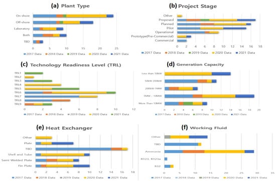 The current status of OTEC-potential for various countries around the world, including research and development, is being investigated and analysed, every three-months, under the commission of IEA-OES [20,21]. Currently, planning, installation, and operation of OTEC are in progress at about 20 locations around the world (Figure 8). The results of on-line surveys of global OTEC status are summarized with respect to type, project stage, generation capacity, heat exchange, working fluid requirements, and so forth (Figure 9). OTEC Plants can be onshore or offshore, or combinations of both.