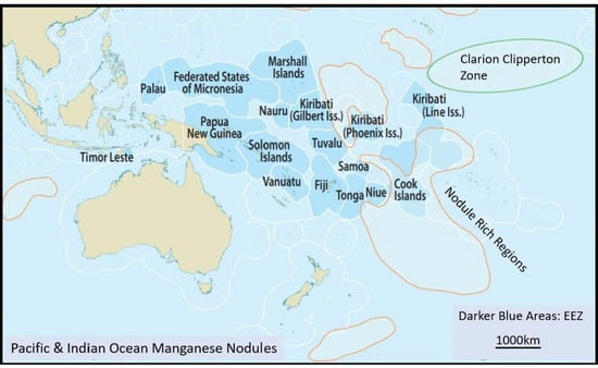 Map of Manganese Nodule Rich Regions in parts of the Pacific and Indian Oceans. Pacific Island State Exclusive Economic Zones (EEZ) shown in darker blue. Nodule rich fields are bounded by brown lines. The Clarion Clipperton Zone contains the world most abundant Manganese Nodule Field [27]. Reproduced with permission, and with full acknowledgement, SPC (Pacific Community).