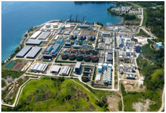 Aerial image of the Basamuk Refinery in Papua New Guinea (Cardno, 2013 [30]). Reprinted with permission from SPC (Pacific Community). https://miningdataonline.com/property/3323/Ramu-Mine (accessed on 30 May 2021).