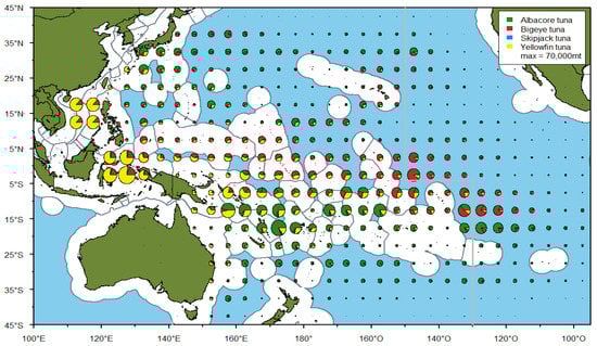 Spatial distribution of the purse seine catch by Tuna species in 2015–2019 in the WCPO. The size of the largest pie corresponds to the maximum value of 1,031,000 t (Hare et al., 2020 [35]). Reprinted with permission from SPC (Pacific Community).
