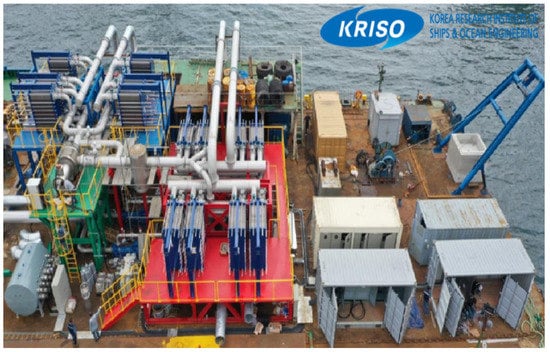 Since 2008, the United States, Japan, and France have resumed research and development for seawater temperature thermal gradient OTEC generation, and additionally, in 2011, Korea, developed a 100 W class land-based proto-type OTEC plant (Figure 5a), followed by a 20 kW class pilot OTEC plant (Figure 5b) in 2012–2013 [13], by the Korea Research Institute of Ships and Ocean Engineering (KRISO) with affiliated clean ships and offshore plants developed from 2011. The hybrid OTEC system to produce about 200 kW (Figure 5c) was fabricated and demonstrated in 2014, that used deep ocean water as a heat sink (5 °C) and waste heat from a wood gasification generator as a heat source (75 °C) [16]. Based on this, in 2019, a 1000 kW class OTEC demonstration plant (Figure 6) was produced, and a performance evaluation field test was successfully conducted in the south eastern sea, of the East Sea of Korea, demonstrating the production of 338 kW of electricity, with a relatively small temperature difference [17]. If this plant is installed and operated in the equatorial ocean latitudes with local temperature differences of 24 °C or higher, it is estimated that about 1000 kW will be produced.