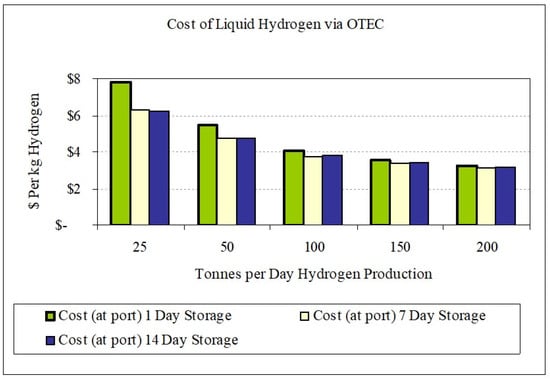 Hydrogen production costs according to the size of OTEC-H2 plant (Makai Ocean Eng., 2000 [39]). Reprinted with permission from Richard Argall, Makai Ocean Engineering, Inc.