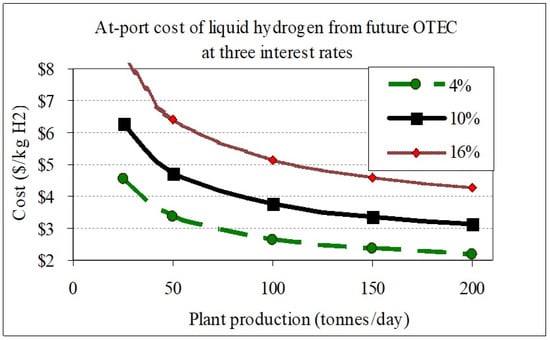 Hydrogen production costs according to size of OTEC-H2 plant and interest rate (Makai Ocean Eng., 2000 [39]). Reprinted with permission from Richard Argall, Makai Ocean Engineering, Inc.