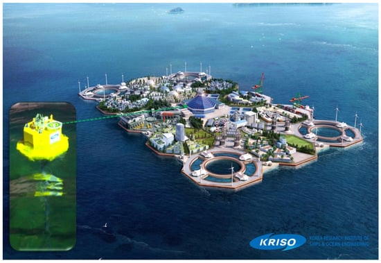 Conceptual drawing of sustainable and self-sufficient oceanic base of very large floating structure for OTEC-H2 system (KRISO, [41,42]).