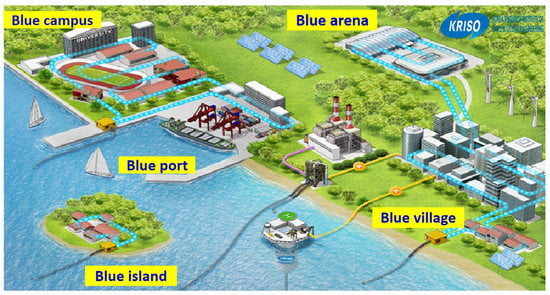 If seawater energy and onshore energy are combined, a range of eco-friendly blue-green infrastructures can be assembled encompassing industry, residences, recreational areas, on and off-shore. OTEC and offshore solar power generation, sea water air conditioning (SWAC) and freezing or refrigeration, seawater desalination and extraction of useful substances, aquaculture and plant factories, and land and sea forest development could be created in urban and rural areas alongside infrastructure such as ports and airports (blue ports), universities, and public institutions. Furthermore, features (Figure 29) such as the Blue campus, sports, and cultural facilities (Blue arena) [44], and energy-independent villages and islands, can be created alongside the OTEC and seawater utilization technologies.