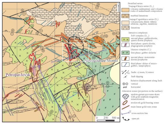 - Trofimov, A.P.; Lyuchkin, V.A.; Pivovarov, A.P.; Funtikov, B.V. Geological and Geochemical Model of the Novogodne-Monto Gold-Ore-Skarn Deposit in the Polar Urals. Skarns Genes. Ore Miner. 2005, 102–107. [Google Scholar]