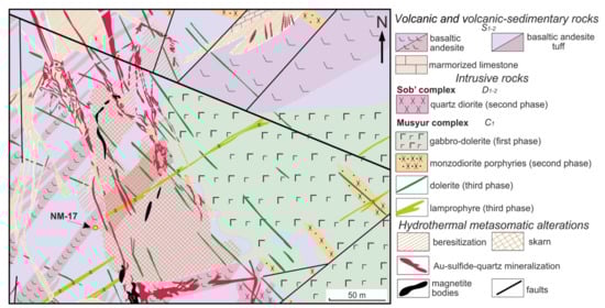 48]. The ore district is located in a long-lived tectonic zone forming a series of faults oriented in a north-west direction, which are recognized as some of the key conduits for various types of ore mineralization [