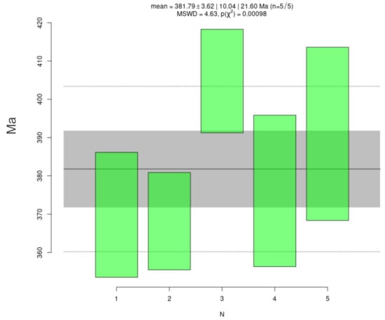 - Vermeesch, P. Three New Ways to Calculate Average (U-Th)/He Ages. Chem. Geol. 2008, 249, 339–347. [Google Scholar] [CrossRef]