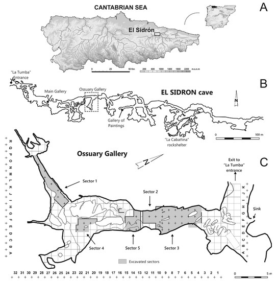 El Sidrón cave: (A) Geographical location of the El Sidrón cave; (B) cave map with the location of the main galleries; (C) excavation plan of the Ossuary Gallery.