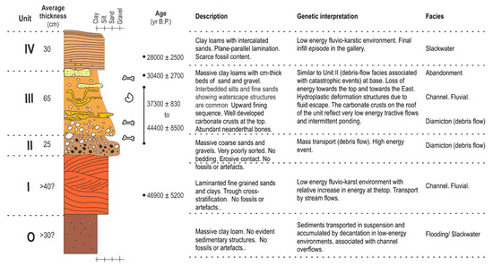 The sedimentary infill in the Ossuary Gallery shows great complexity, thus making it hard to define a stratigraphic column representing the whole gallery. Five main units corresponding to events with different hydrodynamic and sedimentary characteristics are better documented in the central zone of the Ossuary Gallery [16,19,31] (Figure 2). From bottom to top, these are: