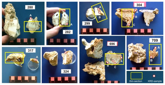 Bone remains with sampled calcareous concretions. The locations of both XRD analyses (dots) and thick sections (yellow rectangles) are given. See Table 2 for A, B, C, D.