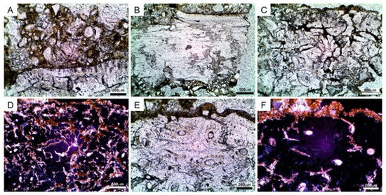 Micritic crusts show diagenetic microfabrics as clotted-to-peloidal micrite–microsparite, NFC, and clay coatings or cutans that point to microbial biological activity in a subaerial environment [24,35]. Clotted peloidal fabrics are common in microbial formations such as travertines, stromatolites, and thrombolites [36]. The observed NFC aggregates rarely completely fill the pores in which they occur, creating a fine interlacing partial infilling. NFC usually forms in the early phase of pedogenesis and precipitates as cement in vadose conditions [37]. NFC can also be found on cave walls in association with speleothems [38]. NFC’s origin has been discussed for many years, but several recent studies have supported arguments for its directly or indirectly biogenic origin [38,39,40], although the micro-organisms responsible for its formation have still not been identified [40]. However, some studies have suggested that NFCs are largely a product of abiogenic vadose precipitation that involved little or no biological influences [41].