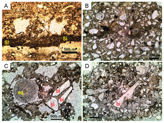 Figure 7. Microphotographs of feature characteristics of calcite crusts with abundant siliciclastic grains: (A) thin silty micritic crust (Si) on bone surface; a net contact with the overlying sandy and more porous crust can be observed (Sample 280). (B) Detail of sandy crust with a high proportion of subangular quartz grains in a micrite matrix (Sample 709). (C) Bioclast (echinoderm) (eq) and bone fragments (bi) in sandy micritic crust (Sample 324). (D) Bone fragments (bi) in sandy micritic crust (Sample 324). All microphotographs were taken under plane-polarized light. - Sandy (yellowish) crusts up to 2–3 cm thick, directly developed on the surface of the bones or on the previously described silty crusts. Their colour is lighter, and their clays and iron oxide content are lower and more dispersed. On the contrary, the content of terrigenous grains is higher (Figure 7B). The nature of the grains is mostly quartz, with a very variable size (40–800 µm) and the majority being 50–250 µm thick. Quartz grains seem to display a bimodal sorting with fine, subangular (dominant), and coarser rounded grains. Feldspars, metamorphic rock fragments, and carbonate bioclasts are also present, although to a lesser extent, as are bone fragments (chips) of varying size and morphology (Figure 7C,D). The size of the calcitic cement crystals is microsparitic to mesosparitic (40–100 µm), and an increase in the size of the detrital grains and in the porosity can be observed as one moves away from the bone surface. There are darker (orange) areas that are irregularly dispersed and about 50 µm thick; these correspond to a higher content of clays and smaller size of the quartz grains and crystals of calcite cement. Voids are scarce and mostly correspond to regular vugs or planes. Associated with large voids, discontinuous clayey cutans (clay coatings) can be observed, as can some calcitic cement fillings consisting of palisades (sometimes radially arranged) composed of calcitic tabular crystals with a maximum length of 0.5–0.6 mm. This type of crust is the most abundant at the studied sector of the site.