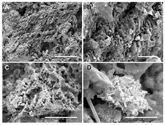 Figure 9. SEM micrographs of sparitic calcite crust: (A,B) partially dissolved scalenohedral calcite crystals (Sample 304); (C) detail of calcite scalenohedral terminations (Sample 696); (D) microcrystalline aggregate with needle-fibre calcite (NFC) crystals (Sample 696). - Micritic crusts, normally with a compact and massive microstructure and locally characterized by the presence of an irregular lamination involving the alternation of (1) dark laminae (0.05–0.2 mm thick) of dense micrite and (2) laminae of variable thickness (0.1–1 mm) consisting of less dense, clotted-to-peloidal micrite–microsparite that locally present with a wavy–cloudy structure (Figure 10A,B). Areas with the presence of dispersed terrigenous grains (mainly quartz) of variable size (25–100 µm) are present. Peloidal or spherical structures have diameters ranging between 5 and 80 µm (Figure 10B). In some cases, acicular crystals (1–2 µm thick and approximately 10 µm long) are present in a random deposition (Figure 9C). These are whisker or needle-fibre calcite (NFC) morphologies (Figure 10C). They are arranged to fill small pores or partially cover the large ones in association with the clayey patina (clay coatings and cutans) (Figure 9D). In some cases, their recrystallization to microsparite crystals is intuited. In the sometimes-transitional contact zones with the yellow–orange terrigenous-rich crusts, the abundance of fibrous textures, NFC, is significantly higher. In some cases, an undulating banded arrangement can be observed (Figure 9A).