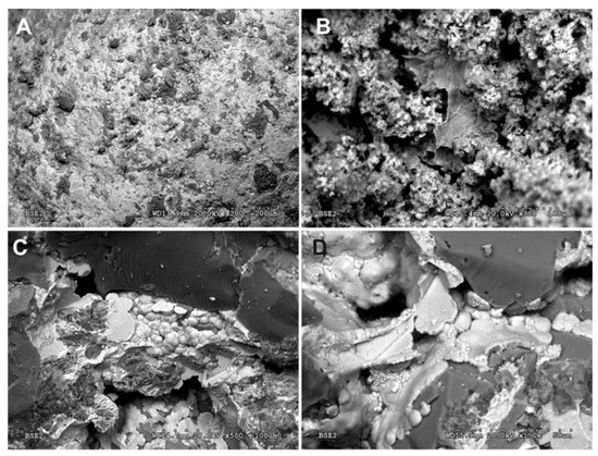 All the bone remains from El Sidrón cave are embedded in a dense, poorly sorted, sandy-silt matrix with a porphyritic, coarse-/fine-related distribution (coarser fragments floating in a finer matrix). They are highly dehydrated, crumbly, and have multiple microcracks that, in some cases, have become cracks and fractures (Figure 5A,B). The degree of physical deterioration is variable, from fragments that present a marked fragmentation that makes their morphological study impossible to those that fully retain their morphology [2,34]. Additionally, a large amount of the bones appear to be coated with authigenic mineral coatings of different types and developments that are sometimes interbedded with different type of crusts.