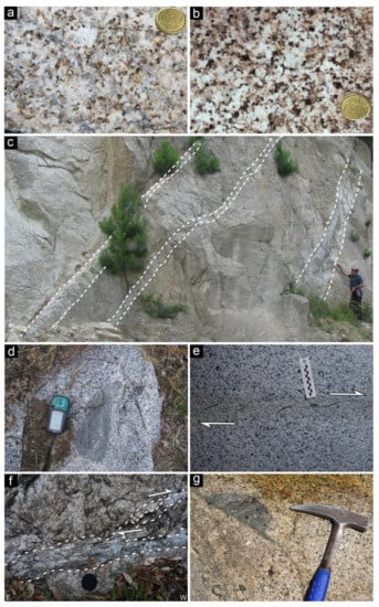 The granitoid outcrops studied in this work are from two transects (Figure 1), each of them crossing the transition between MBG and BAG. At the outcrop scale, relationships between these rocks are not easy to define, since no intrusive contact has been observed in the studied area and an extreme alteration often prevents fruitful field observations. Both lithotypes are characterized by slightly heterogeneous grain size and are generally massive (Figure 2a,b); BAG are usually slightly coarser-grained than BMG, with the former typically showing coarser biotite prismatic grains, sometimes gathered into polycrystalline aggregates. A thick system of veins and aplitic-pegmatitic dykes, reaching locally a meter in thickness, mostly characterizes MBG (Figure 2c). Another key character is the occurrence of mafic enclaves, usually globular but locally evolving into more stretched shapes (Figure 2d), with their abundance much higher in the BAG. Rare occurrences of narrow shear zones have been observed within the BAG (Figure 2e–g), sometimes evolving into mylonitic bands up to 5 cm thick.