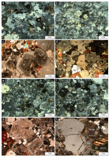 BAG and MBG crop out in the central to southernmost sector of the Serre Batholith. According to [90], a gradual transition occurs in the central Serre, from border BAG, intruding the upper crustal basements rocks, to inner MBG. Both rock types show a slightly inequigranular structure due to coarser biotite crystals. BAG consist of zoned plagioclase crystals with An61–44 cores and An51–23 rims [90,95], orthoclase, biotite and rare amphibole (up to 3 vol.%), forming aggregates with biotite, apatite, allanite and zircon. In MBG, plagioclase is zoned from andesine to oligoclase; biotite is more enriched in Fe and Altot and more depleted in Mg than in BAG; muscovite appears either as crystallized together with quartz and K-feldspar or as a secondary product replacing plagioclase and biotite, while no amphibole or allanite occurs. Both BAG and MBG contain mafic microgranular enclaves up to more than 50 cm in size, but their abundance drastically decreases in the transition to the MBG. Centimeter-sized metabasic enclaves only occur in BAG, whereas similarly sized metapelitic enclaves, although more abundant in MBG, are present in both granitoid types. Finally, both rock types are locally intruded by late- to post-tectonic aplitic-pegmatitic dykes [30,82].