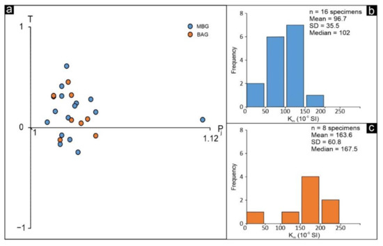 The mean magnetic susceptibility (Km) value calculated from the available data (Figure 6b,c), is of ca. 163.6 × 10−6 SI units for the BAG, with a maximum value of 247 × 10−6 and a minimum of 47 × 10−6; the mean magnetic susceptibility value for the MBG is 96.7 × 10−6 SI units, with a maximum of 162 × 10−6 and a minimum of 12.6 × 10−6.