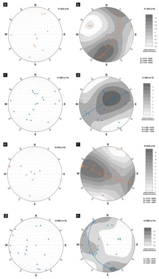 Figure 7 shows lower-hemisphere, equal-area projections of K1 (magnetic lineation) and K3 (poles to magnetic foliation) in the BAG and MBG, respectively. Poles of BAG magnetic lineation are plotted on stereoplots (mean value 189°/28° C in trend/plunge format, Figure 7a,b), where they appear dispersed along a best fit great circle roughly NNE–SSW oriented (117°/60° in dip direction/dip format). Poles of MBG magnetic lineation (mean value 51°/68° C in trend/plunge, Figure 7c,d) outline a weak preferential trend as well, as highlighted by contour lines in Figure 7d, with a best fit great circle mainly ENE–WSW oriented (337°/85° in trend/plunge). The mean magnetic foliation of BAG is dipping to the east (105°/51° C in dip direction/dip; Figure 7e,f), while magnetic foliations of MBG (Figure 7g,h) are highly dispersed along a NNW–SSE trend plane, as illustrated by contour lines (Figure 7h; main foliation plane is 148°/86° C in dip direction/dip).
