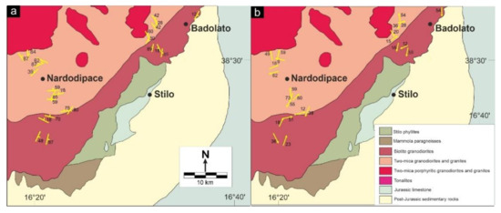- Festa, V.; Tursi, F.; Caggianelli, A.; Spiess, R. The tectono-magmatic setting of the Hercynian upper continental crust exposed in Calabria (Italy) as revealed by the 1:10,000 structural-geological map of the Levadio stream area. Ital. J. Geosci. 2018, 137, 165–174. [Google Scholar] [CrossRef]
