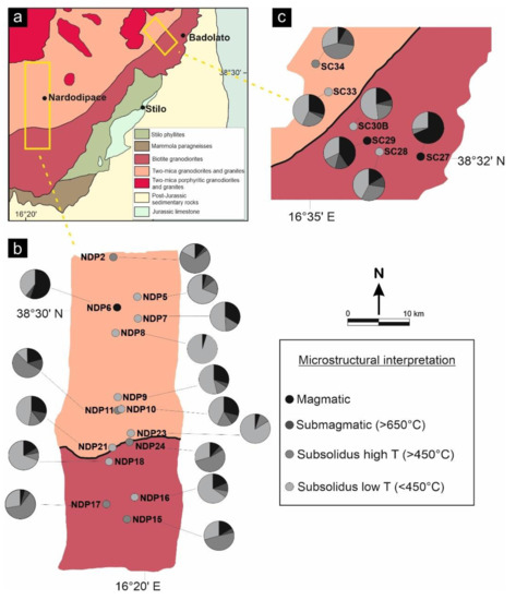 Lastly, the samples from the transects (Figure 1a) were used for a semi-quantitative study aimed at assessing any possible relationship between rock type/emplacement depth and type and relative incidence of microstructures recorded from magmatic to low-temperature subsolidus conditions. For each studied thin section, the frequencies of each microstructure exhibited by the different mineral phases were reported in a table sheet, grouped by related temperature conditions, and finally converted into pie charts.