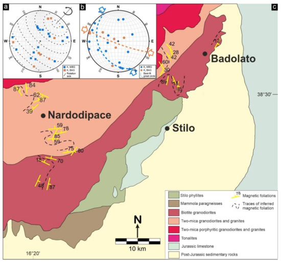 The Pj vs. T (Jelinek) plot (Figure 6a) shows that the shape of the AMS ellipsoids varies between oblate and prolate, although the oblate shape is more prominent for both BAG and MBG. In more detail, T value varies from 0.412 (sample_NDP16) to −0.119 (sample SC29A) in the BAG, and from 0.559 (sample_NDP24) to −0.231 (sample SC33) in the MBG. A mainly oblate AMS ellipsoid identifies a dominant flattened fabric in the studied granitoids, indicating that magnetic foliation is more developed than magnetic lineation. This is consistent with microstructural data by [27], indicating that fabric ellipsoids in the Serre granitoids mostly exhibit an oblate shape and therefore suggest a flattening deformation. However, it is to be noticed that magnetic axis values for the studied upper crustal granitoids are very close to each other and they actually result in a spheroidal shape, rather than ellipsoidal. On the other hand, the results from the above diagrams indicate that the granitoids hold a magnetic fabric, even though of a quite weak intensity. An exception is observed for a single sample (NPD−9; MBG) with an appreciable microstructural fabric represented by oriented mica flakes and dynamically recrystallized grains, which are characterized by much higher values of the plotted magnetic parameters (Table 1).