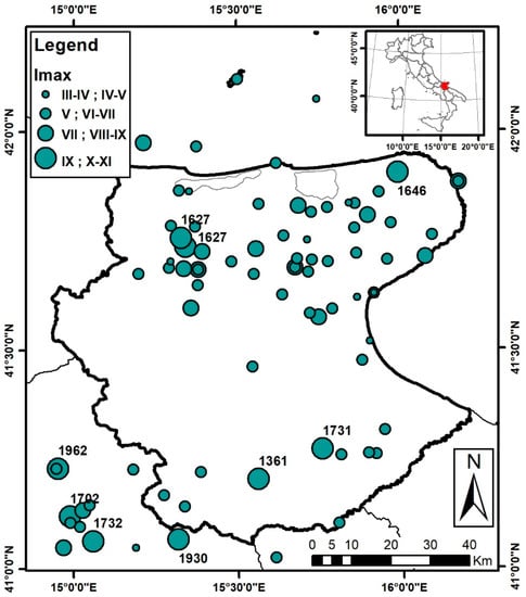 Dots represent epicenters of the main seismic events with maximum intensity (Imax) larger or equal to III-IV MCS that occurred in the study area and surroundings between 1000 and 2019 AD [] (size is proportional to the relevant Imax value). The year of occurrence of the events characterized by Imax larger or equal to IX MCS is shown. The thick and thin black lines represent the border of the study area and the Italian regional administrative limits, respectively. The red area in the top right panel indicates the geographical position of the Northern Apulia area with respect to Italian territory.