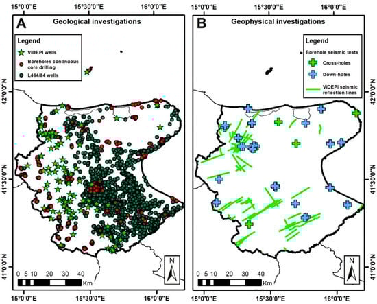 Location of the geological (A) and geophysical (B) investigations available in the study area. The thick and thin black lines represent the border of the study area and the Italian regional administrative limits, respectively.