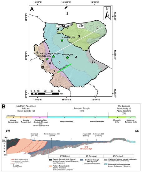 (A) Map of the morphostructural domains (delimited by thick black lines) and subdomains (colored zones delimited by gray lines) constituting the study area. In particular, subdomains 1b, 2 and 3 belong to the Gargano Promontory of Apulia Foreland; subdomains 1a, 1c, 4 and 5 belong to the Bradanic Trough; subdomains 6, 7 and 8 belong to the Southern Apennines Fold and Thrust belt. Green stars and green lines represent the ViDEPI Project investigations (Figure 2) used to constrain the schematic geological cross-section shown in panel B, whose trace is represented by the white line. Thin black lines represent the Italian regional administrative limits. (B) Schematic geological cross-section representing the overall configuration of the study area (modified from [,]).