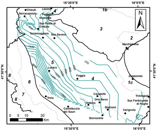 In the inner-western sector (subdomain 8 in Figure 3), the geological bedrock is characterized by Late Cretaceous to Langhian, multilayered, calcareous-marly-pelitic and arenitic-marly-pelitic siliciclastic lithologies (Fortore Tectonic Unit []). In the outer-western sector (subdomain 7 in Figure 3), the bedrock is constituted by upper Cretaceous to early Miocene successions made by pelitic-calcareous and arenaceous deposits (Daunia Tectonic Unit [,]), passing to Lower-Middle Pliocene deposits. Finally, the eastern part of SFTB bedrock (subdomain 6 in Figure 3) is characterized by a buried thrust front deforming Miocene-Pleistocene deposits forming basins developed during the eastward migration of the tectonic front [,]. These basins are characterized by coarse continental and shallow silty-clay deposits.