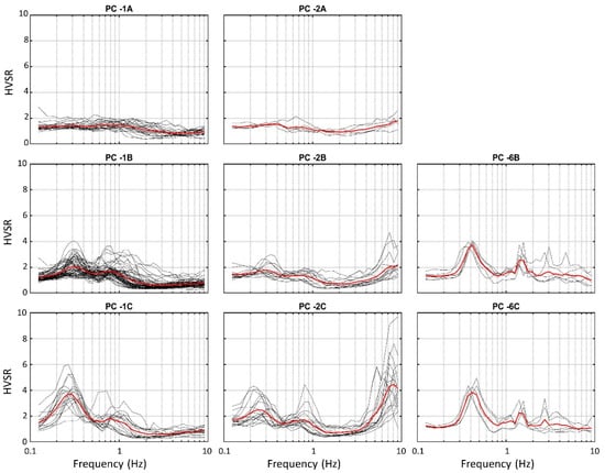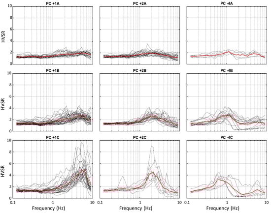 Figure 6 and Figure 7 show the experimental and the respective group-average curves (black and red curves, respectively) corresponding to the most populated classes by also considering the respective amplitude subclasses. As can be noted by Table 3, PC +1 and PC-1 classes dominate 101 and 105 sites, respectively, out of the 403 considered. Observing these two patterns, it is possible to see that the PC +1 class identifies one main peak at 5.5 Hz (Figure 6), while PC-1 is characterized by a multiple peak pattern: beyond the 0.3 Hz maximum (F0), a secondary peak at 0.8 Hz (F1) is present (Figure 7). Unlike the F0 maximum, the amplitude value of the higher frequency peak remains about two in all the three subclasses, pointing out that a weak impedance contrast is possibly responsible for this effect. A similar situation can be observed for PC +2 and PC-2 classes: in the first case, only one peak at 2 Hz is detected (Figure 6), while the PC-2 class is characterized by a multiple peak pattern very similar to PC-1, where the only difference is given by the presence of a higher frequency peak located at 8 Hz (F2) (Figure 7). As concerns the PC-4 class (Figure 6), group-average curves with broad peaks appear in the range of 0.65–1.2 Hz: by observing the experimental groupings, it is possible to note that the broad maximum actually results from a set of close sharp HVSR peaks included in this frequency range. It is worth mentioning the case of the PC-6 class, whose pattern is characterized by a couple of peaks at 0.4 Hz and about 1.5 Hz (Figure 7). After a careful analysis of the individual component spectra, it is possible to realize that the higher frequency maximum is related to an industrial disturbance (e.g., [,,]): the existence of this class testifies the capability of PCA in highlighting the HVSR curves affected by this kind of anthropic anomalies.