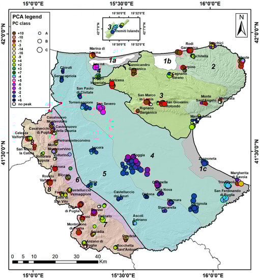 Finally, it is worth mentioning some minor class groupings showing differences with respect to the general pattern distributions described above. For example, within the GP domain, it is possible to note the PC-1A and PC-4 pattern groupings in Manfredonia and Tremiti Islands municipalities, respectively, and, within the BT domain, the presence of a group of sites where PC +1 and PC−3 patterns are located close to Margherita di Savoia and Marina di Lesina (in southeast and northern part of this domain, respectively).