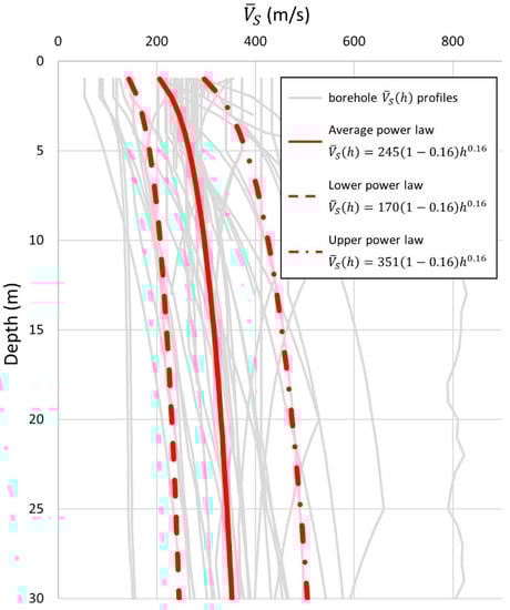 where VS is the S-wave velocity at the depth h, and V0 and x are empirical parameters to be computed case-by-case. From Equation (1), one can see that the average velocity down to the depth h has the form: