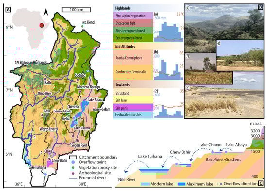 Overview of the study area with sites mentioned in the text, investigated lakes, overflow dynamics and modern-day potential vegetation. (A) Catchment of the Omo River, lakes Abaya and Chamo and paleo-lake Chew Bahir with lake’s overflow locations. Hill-shaded potential vegetation is based on Friis, et al. [3]. (B) Legend of potential vegetation arranged by altitude with (a to c) monthly temperature means in °C and precipitation in mm per month (IRI, last accessed 12/2020). The locations of the photographs of representative vegetation regimes (d to g, photos from Annett Junginger) are marked on the catchment map. (C) Cross-section from Lake Abaya to Lake Turkana showing the overflow direction and lake ladder with their prevailing potential vegetation (numbers correspond to the potential vegetation types marked on A and B).