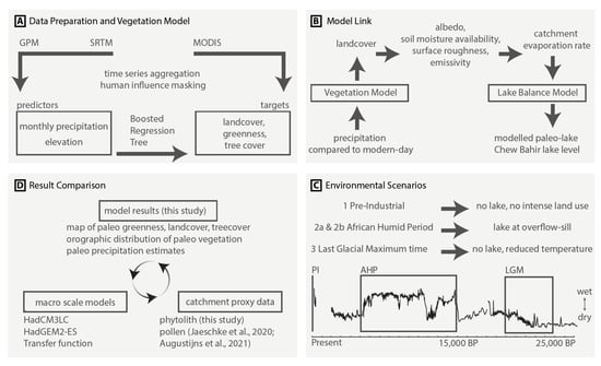 Summary of methods in this study. (A) Dataset collection: Modern Global Precipitation Measurement (GPM), Shuttle Radar Topography Mission (SRTM) elevation data, Moderate Resolution Imaging Spectroradiometer (MODIS) vegetation and landcover data. Dataset preparation included time series aggregation from 2001 to 2018 with human influence masked using Open Street Maps, and Boosted Regression Tree model training. (B) Vegetation and LBM link using precipitation as input to predict landcover, resulting surface parameters and ET based on [75], the resulting lake balance of lakes Abaya, Chamo and paleo-lake Chew Bahir and, hence, the lake surface elevation of paleo-lake Chew Bahir. (C) Three different environmental scenarios are applied in this study: Pre-Industrial time with modern-day climate, reduced or eliminated human influence and to be modelled potential landcover, and AHP and LGM time based with major assumption for this model. All three scenarios are visible in the Potassium record in the lacustrine sediments of paleo-lake Chew Bahir [33]. (D) Comparison with global paleo reconstructions (macro scale) and catchment (small scale) proxy-based reconstructions including the phytoliths from the current study.