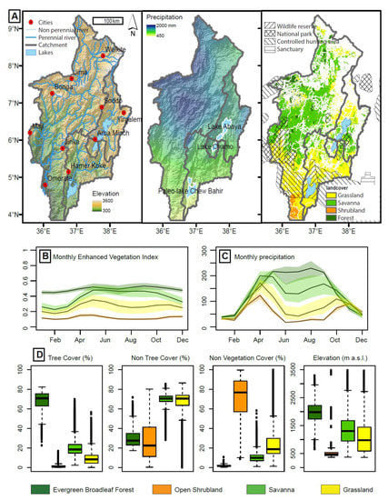 - Asefa, M.; Cao, M.; He, Y.; Mekonnen, E.; Song, X.; Yang, J. Ethiopian vegetation types, climate and topography. Plant Divers. 2020, 42, 302–311. [Google Scholar] [CrossRef]