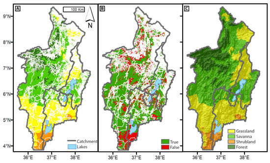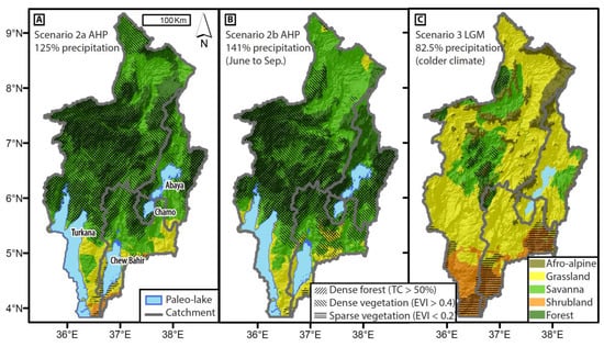 The combined LBM for the 2a AHP scenario with no change in the seasonality of the precipitation shows a lake occurrence of paleo-lake Chew Bahir under modern-day precipitation conditions. With increasing precipitation from 15 to 20%, the model shows initially no lake, which changes as soon as the threshold of 25% precipitation is reached and a lake is (re)established. In the 2b scenario, as a theoretical contrast scenario with additional precipitation in June to September, the threshold for lake appearance is at ~41% more precipitation compared to today. For scenario 3, the modelled LGM environmental conditions, caused the lakes to disappear below 80–85% of the modern-day precipitation. We used these thresholds (2a—125%, 2b—141%, 3—82.5%) as minimum (AHP) and maximum (LGM) precipitation thresholds and as input parameters for the spatial reconstruction of the vegetation mosaic during these time periods by combining the LC-BRT, the EVI-BRT and the TC-BRT (Figure 6). We added the maximum lake extents of lakes Abaya, Chamo and paleo-lake Chew Bahir [10], as well as Lake Turkana [12] for the AHP scenarios. During the LGM, the model suggests that a desiccation of lakes Abaya and Chamo would have required 10% further reduction in precipitation than required for the desiccation of paleo-lake Chew Bahir (Figure 5C).