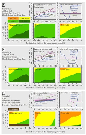 Model Results for Scenario 2a AHP (A), 2b AHP with CAB (B) and 3 LGM (C): modelled annual ET on land for each catchment (lakes Abaya, Chamo and paleo-lake Chew Bahir) for the given precipitation from 100 to 150%, respectively, 50 to 100%; LBM resulting lake levels of lakes Abaya, Chamo and paleo-lake Chew Bahir and vegetation model result with changing LC for each catchment. Scenario 3 ET has an upper and lower boundary due to the modelled temperature decrease range (3–4 °C).
