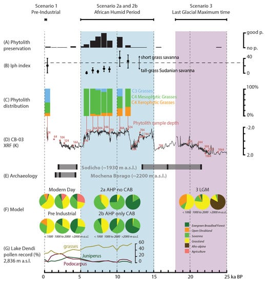 Proxy time series and model results: (A) Phytolith preservation. (B) Iph index. (C) Phytolith type distribution. (D) Potassium proxy record of CB-03 [33]. (E) Archaeological record with dated (confirmed) occupation (black) [59,60,64] and presumed occupation (grey). (F) Orographic strata model results with LC. (G) Lake Dendi pollen record summary [16].