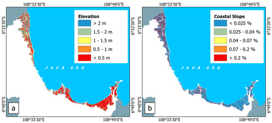 To investigate the vulnerability in coastal zones, a range of parameters and indexes, including physical vulnerability, can be applied [57,84]. Several parameters were used to address the vulnerability components (V). These are shown in the thematic maps (Figure 4). Firstly, (V1) elevation data were extracted from topographical data of DEMNAS (0.27 arc-second) resolution from the Geospatial Information Agency (here referred to as BIG: Badan Informasi Geospasial). The elevation has been categorized into 5 groups (0.5 m; 0.5–1 m; 1–1.5 m; 1.5–2 m, and >2 m). This information generally depicts the coastal altitude conditions [39,69]. This component plays a significant role in identifying areas at risk of flooding during an event [85]. Salt farming is mostly located in the coastal plain within 1–2 m elevation. The variable coastal slope (V2) indicates the degree of elevation variability in bordering grids [86]. The possibility of flooding rises as the slope declines, making it a relevant indicator for vulnerability [87]. Salt ponds require a relatively slight slope to facilitate the sea water flow and to reduce construction expenses [88]. In line with Silva et al. [54], the slope in the case study area was classified into categories of <0.025%, 0.025–0.04%, 0.04–0.07%, 0.07–0.2%, and >0.2%. Another considered indicator, geological features (V3), significantly influences the drainage pattern formation associated with the floodplain formation [89]. In this study, specific classes were included: flood plain deposits, sand with silts and clays, mountain formations, and younger volcanic formations. This classification was taken from the Directorate of Geology and Environmental Planning (DGTL) vector data. Soil type (V4) is a relevant factor affecting infiltration and runoff during floods [71]. In traditional salt farming, salt production has major implications for productivity, water quality, and pond construction [90]. The DGTL soil map, scale 1:100,000, reveals that the soil of the Cirebon region is divided into four major types, Alluvial, Gleysol, Cambisol, and Latosol, although the salt pond area is dominated by Alluvial soil. This dominant soil type is the result of sedimentation from streams and rivers or of marine sediments along ocean shorelines [91]. To identify the soil characteristics, Subardja et al. [92] and Sulaeman et al. [93] were used as sources for this study. Finally, both distance to channel (V5) and distance to shore (V6) influence the breaching of water during floods and overtopping water from the channel. This study classified distance to channel into <200 m, 200–400 m, 400–600 m, 600–1000 m, and >1000 m [94], and distance to shore into <250 m, 250–500 m, 500–750 m, 750–1000 m, and >1000 m. All mentioned classification references were defined in the level of vulnerability to tidal flood events.